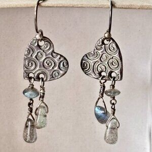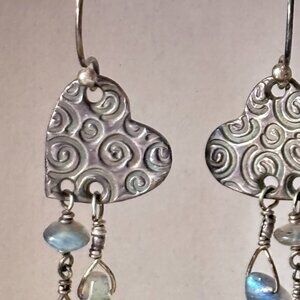 Handmade Earrings Silver Heart with Dangling Tiny Polished Stones
