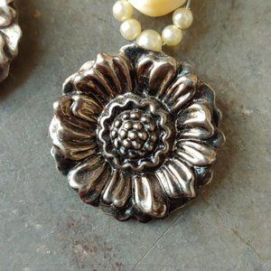 Handmade Earrings Silver Metal Flower and Pearl Bead Recycled Repurposed