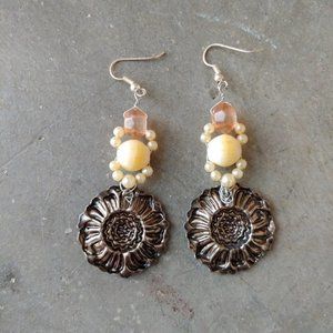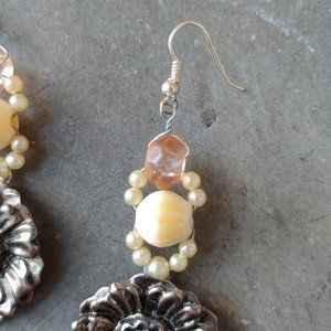 Handmade earrings made with metal flower pendants, plastic and faux pearl beads, and silver metal wire. Silver metal fish hook earrings. Twine and Stones jewelry is made from repurposed materials and may have unique patina. This pair of earrings does not come with tags but is a new, handmade boutique item by me. 2" long. Pendant is 1" diameter. No trades. No modeling. Make a reasonable offer. Thanks!