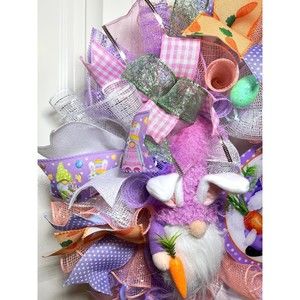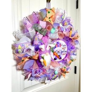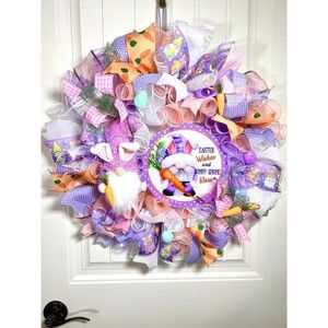About 22 inches, 6 inch-deep door or mantle wreath. Purple, White & coral mesh back. Spring/Easter themed w/ vibrant colored wired ribbons (9 styles). An “Easter Wishes and Bunny Gnome Kisses” sign, glitter eggs & carrots and a plush bunny gnome holding a carrot adorn this wreath.