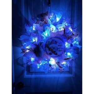 This wreath is built on an 14 inch frame. Perfect for decorating your home for Easter/ Spring. Fitted with 20 LED lights to illuminate at night; 3 modes.