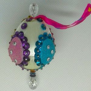 Completely handmade. White easter egg ornament. There's 4 adhesive foam apx. 3/4" stickers on it=purple glitter with 6mm dark purple sequins & 11/0 fuschia lined aqua seed beads;yellow glitter with 8mm Orange glitter sequins &11/0 yellow seed beads;pink glitter with 6mm light pink sequins&11/0 fuschia seed beads;and turquoise glitter with 6mm teal sequins&11/0 light blue seed beads. All foam stickers have adhesive clear rhinestones. Perfect for Easter decoration or a gift for someone special.
