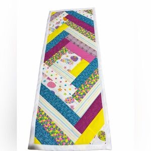 Pretty Easter table runner/topper measures 13-1/2" by 35" long. Quilted with pretty spring/Easter cotton fabric, interfaced and double sided. This was made in my pet free/smoke free shop.