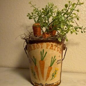 Handmade Easter/Spring decor with faux rust and carrots. Measures 4” x 4