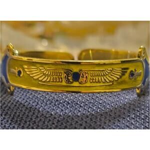 Step into the magic of Ancient Egypt with this one-of-a-kind handmade statement cuff, honoring Goddess Isis—protector of love, freedom, and divine magic. Her outstretched wings are filled with sun-kissed yellow enamel, symbolizing light and power, while deep sky-blue enamel evokes freedom and eternal truth.