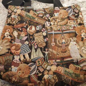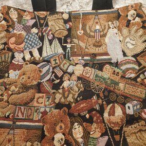 Step into a world of nostalgia with this charming tapestry tote bag, capturing the whimsical essence of childhood toys. The intricate design, reminiscent of a vintage storybook, tells tales of teddy bears and toy trains, weaving a narrative of youthful wonder. Handcrafted with care, this unique piece is both a conversation starter and a functional accessory.