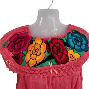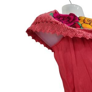 Handmade Embroidered Floral Boho Oxaca Top Pink Red Off The Shoulder Size XS