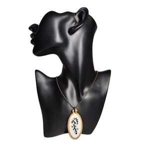 This is a cute, hand embroidered necklace in good clean condition. A black branch on a white background, goes with just about anything! the pendant is wood and the chain measures about 26" in length.
