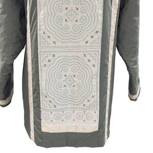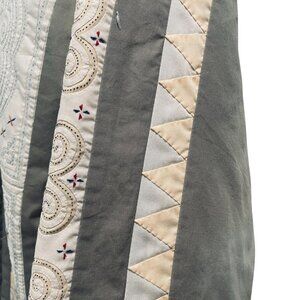 This one-of-a-kind handmade quilted jacket blends folk art charm with cozy sophistication. Featuring intricate embroidery, tonal patchwork, and bold geometric stitching, it showcases a unique boho aesthetic with artisanal detailing throughout. The open front design and lightly padded construction make it a perfect layering piece for cooler months.