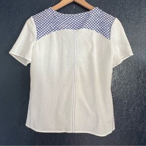 Short sleeve top with embroidered honeycomb detailing, exposed stitching going down the center, and triangle designs on the sides. No size tag but may best fit a Small (measurements provided). Handmade with care. *Anthropology for exposure