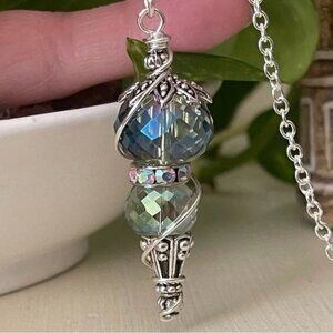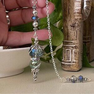 This beautiful handmade dowsing pendulum is made to order with multi-color luster faceted iridescent crystal (glass) beads, silver plated beads/chain and measures 10 inches long. This dowsing pendulum is an original design by True Healing Source ©