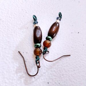 brown Agate, green faux pearl heishi, brown wood, gold tone cube and blue faceted glass bead. Green jewelry wire and hypoallergenic coated earwires. App 2" in length - super lightweight - barely there weightwise.