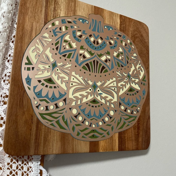 Handmade Fall Thanksgiving pumpkin sign. 8x8” square. Unique metallic layered design. Gold/Brown/blue/cream/green. Non smoking, pet friendly home. All proceeds from my closet sales go to my fathers chemotherapy fund so thanks for looking! All items listed on multiple platforms. Bundle and save! Open to reasonable offers!