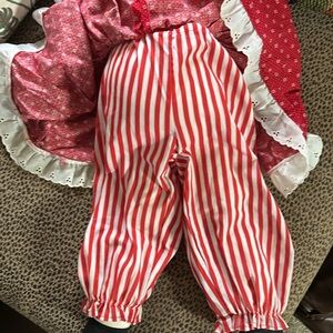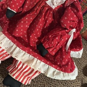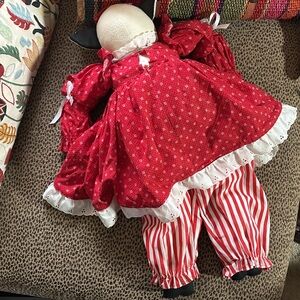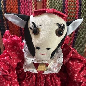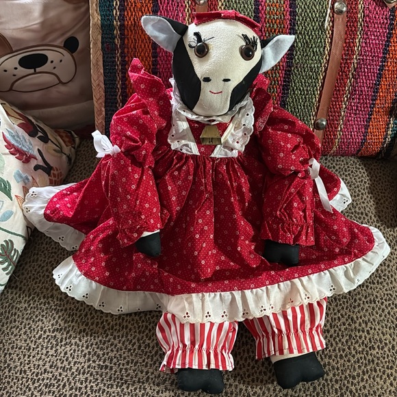 22 inches tall cute cow in dress and pants. Item is handmade. Missing 2 snaps or buttons on dress. Feels like cotton.