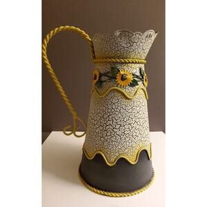 This beautiful metal rooster pitcher is decorated with a rooster and sunflowers, which are dimensional. It is vintage and hand crafted. It is in good condition and will fit in perfectly with your country or farmhouse decor. It is 10" high and 6" wide at the base. The opening is 4" wide.