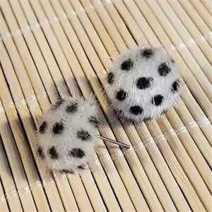 Handcrafted fuzzy faux fur earrings with polka dotted patternMeasures approximately 15mm (about 5/8") diameterRounded "half ball" domed furry cabochons on post earring findingsStainless steel findingsEarnuts (earring backs) included