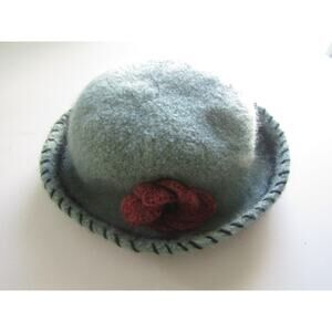 Handmade Felted Wool Cloche Hat Green Red Flower Vintage Style