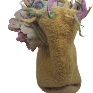 Main body crafted from mustard yellow felted wool with multicolor wool fringe accents on the top edge.