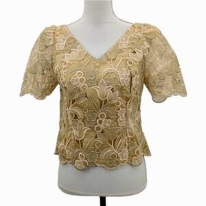 Handmade Floral Embroidered Top Shell Gold Tan Scalloped Zipper Back Mother of the Bride MOTB Size Small