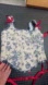 • Finished with navy floral binding and playful red satin ribbon ties at the shoulders