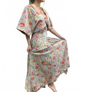 Handmade floral kimono maxi dress. Deep V-neck, dolman sleeves, 29โ waist, 50โ bust, 58โ length. Flattering fit for larger bust. Excellent condition.