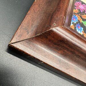 There are a couple of faint stains on the cross stitch. The frame has scuffs, dings, and scratches throughout.