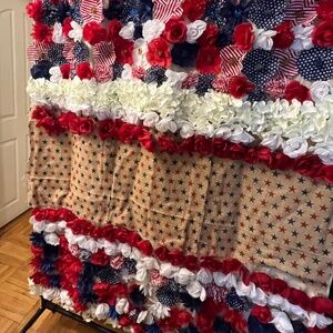 Handmade, Vibrant fabric with red, white, and blue floral and star pattern with burlap. Beautiful handmade Rose and Assorted Flower Wall Backdrop on high quality double lined 52”x63” soft Velvet Cream Colored Fabric. Multi-use item doubles as a beautiful wall tapestry for home decor or for the passing of a Veteran.