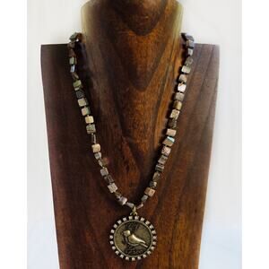 One-of-a-kind handmade artisan necklace with a symbolic “Fly Free” bird medallion. The antique gold-tone pendant features a raised bird motif and is framed with clear rhinestones for subtle sparkle. The chain is made from natural abalone shell cube beads, which shift in color with iridescent blues, greens, and earthy neutrals.