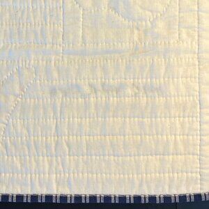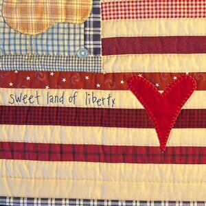 Handmade “Yankee Doodle Doo” patriotic quilted wall hanging, pillow panel, or table topper combines classic American flag patchwork with rustic country farmhouse decor motif. The design includes an array of red, white and blue checkered and star patterned fabrics to represent the flag's elements. A fabric appliquéd chicken with hand stitched embellishments and white sewn on buttons is featured in the blue field of the flag. The phrase "sweet land of liberty" is embroidered in a navy cursive script across the lower red and off white stripes, referencing a line from the patriotic song America (My Country, 'Tis of Thee). A red heart shape with a decorative hand stitched border is appliquéd across red and off white/beige stripes. White backing. Finished edges. Measures 16” x 15”.