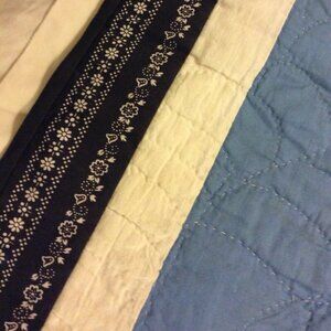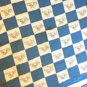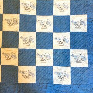 This handmade quilt features a charming love bird embroidery on a blue and white patchwork design. Measuring 69” x 85”, it's suitable for upcycling or crafts.
