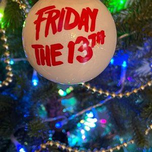 67mm (2-5/8inch) shatter proof ornament ball/bauble. Handmade with white holographic paint for a shift of color when illuminated by light, permanent vinyl for Jason Mask, and Friday the 13th logo. Perfect for any horror movie lover or just a die hard fan of the Friday the 13th franchise.