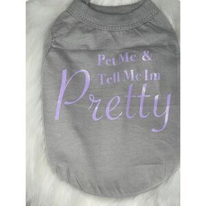 Gray XS Dog or small animal Tshirt that says Pet me and tell me I'm pretty in purple letters, available in s, med and large as well