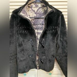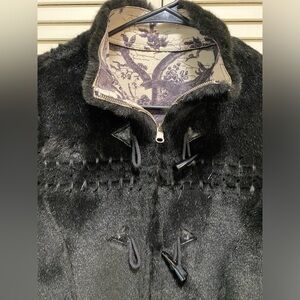 This jacket was beautifully handmade, hand stitched of rabbit fur and suede leather. Zipper & toggle closure, no pockets, no label.
