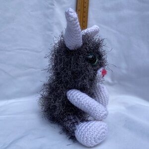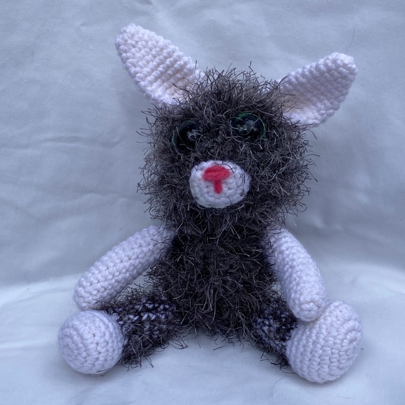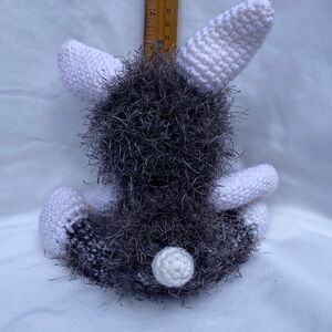 Adorable handmade crocheted plush Rabbit with a furry texture. Features a mix of black and white colors with a touch of pink on the nose. Made with love.