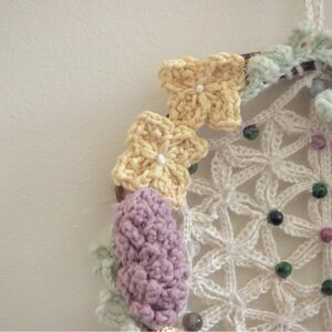 A rustic, handmade willow wreath adorned with crocheted Lavender, Lily of the Valleys, one Ranunculus, Yellow Lilacs and an 18k gold-filled twins charm in honor of the zodiac sign of Gemini. At the center of this wreath lies a crocheted crystal grid with gemstone beads to soothe anxiety and uplift one’s energy. Place in a bedroom or any room where you seek comfort.