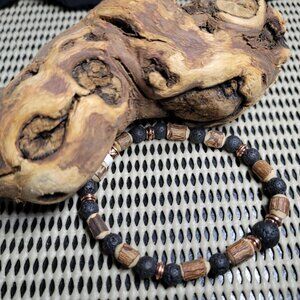 Energy Bracelet #365 | Features Black Lava Rock | Antique Copper Plated Brass | hand cut coconut shell tube beads | Gemstone Properties: Black Lava Rock | Helps dispel anger | fear | negative thoughts and energy