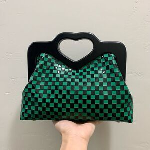 Handmade genuine cowhide with embossed check pattern. Chic cut-out sweet heart handle. Includes 1 chain and 1 leather strap. Use in multiple ways, hand carry, shoulder bag or crossbody. This wooden frame bag holds a lot, spacious enough for your phone, large wallet, book, cosmetics, compact umbrella & other items. Accessorize as a day or evening bag, or a gift for an important someone.