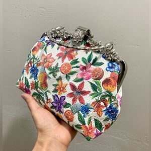 The smaller clutch can hold cosmetics, keys, bank cards, coins. Kisslock closure.