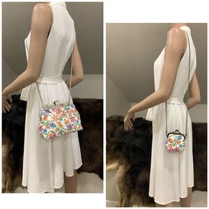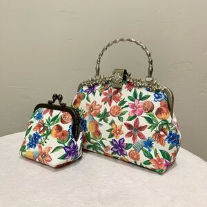 One of a kind. New with tag. Chic design, amazing beautiful & high quality handbag set. Handmade from genuine embossed leather floral printed, with top handle rhinestone metal frame. Use in multiple ways, both can be hand carried or with chains, use together or separately.