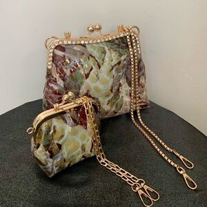 -Big one has a slip pocket inside to hold credit cards or coins, exquisite gold tone hardware metal frame with rhinestones. Reinforced bag bottom and installed with bag feet studs.