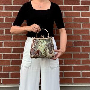 Handmade from special embossed cobblestone texture leather with kisslock metal frame. Included a small purse. Use in multiple ways, both can be hand hold, wrist, shoulder