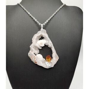 This stunning handmade statement necklace features a natural white quartz geode slice with a genuine citrine crystal nestled inside. The geode sparkles beautifully and is framed in a silver-tone alloy that also securely holds the citrine in place.