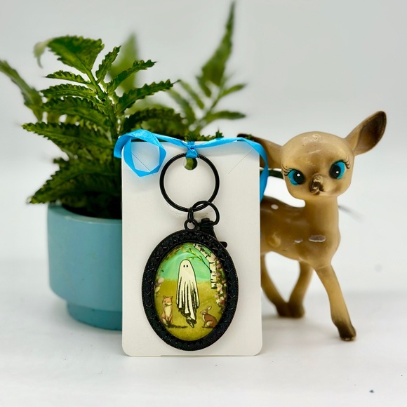 Cute little ghostie with their forest friends. Original artwork sealed under glass onto a black keychain. Lobster claw clasp. Measures approximately 1 1/2 x 2 inches.