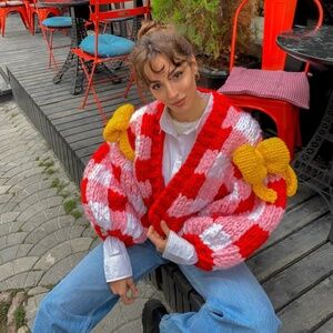 Embrace the charm of gingham with our Handmade Oversized Gingham Cardigan, a unique crop knit featuring elegant ribbon details. This colossal knit cardigan, made from a blend of 50% wool and 50% acrylic, offers both warmth and style, perfect for those who love a cozy yet chic cottagecore aesthetic.