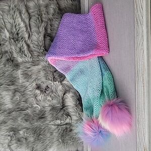 Handmade multi colored scarf with fur pom poms. 50" long - 56" if you include pom pom.