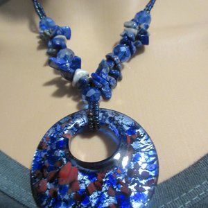 Gorgeous blue tone handmade beaded necklace with pendant. All high quality glass seed beads and accent beads. Pendant is 2" diameter round. Adjustable. Measures 15" open end to end with an 8" drop from the last spot on the snap. Pendant is 2.5" from center of necklace when on. Chain is 3 1/4" long.
