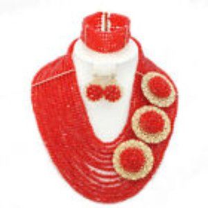 Handmade Glass Bead 7 Piece Statement Set this is a fashion statement set. All hand assembled . These are crystal; glass beads not cheap plastic. The 3 Brooches are removable so you can style to your desire .. less or more.. .." stunning" will be your name when you arrive whether in jeans or a knock out summer dress this set is sure to get compliments as soon as your car door opens !!! The color is a true burnt orange with gold metal as shown in the photos.....