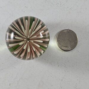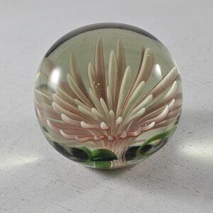 Elegant handmade glass paperweight with delicate pink and white petals and green accents. Ideal for desktop decor and paper organization.