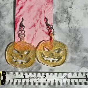 Handmade Jack-o-lantern Pumpkin Earrings. Hook style earrings with rubber backs made with clear resin and orange glitters. Super cute for Halloween!