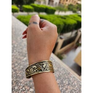 This handmade black and gold bangle features Goddess Isis at the center—protector, and goddess of love, magic, and freedom. The lotus, symbol of rebirth, prosperity, and divine beauty, enhances the power of this ancient design. Made in Egypt from high-quality brass—the same lasting metal used by the ancients for over 5000 years—known for aiding joint pain and spreading positive energy. Limited edition—wear ancient power with modern elegance